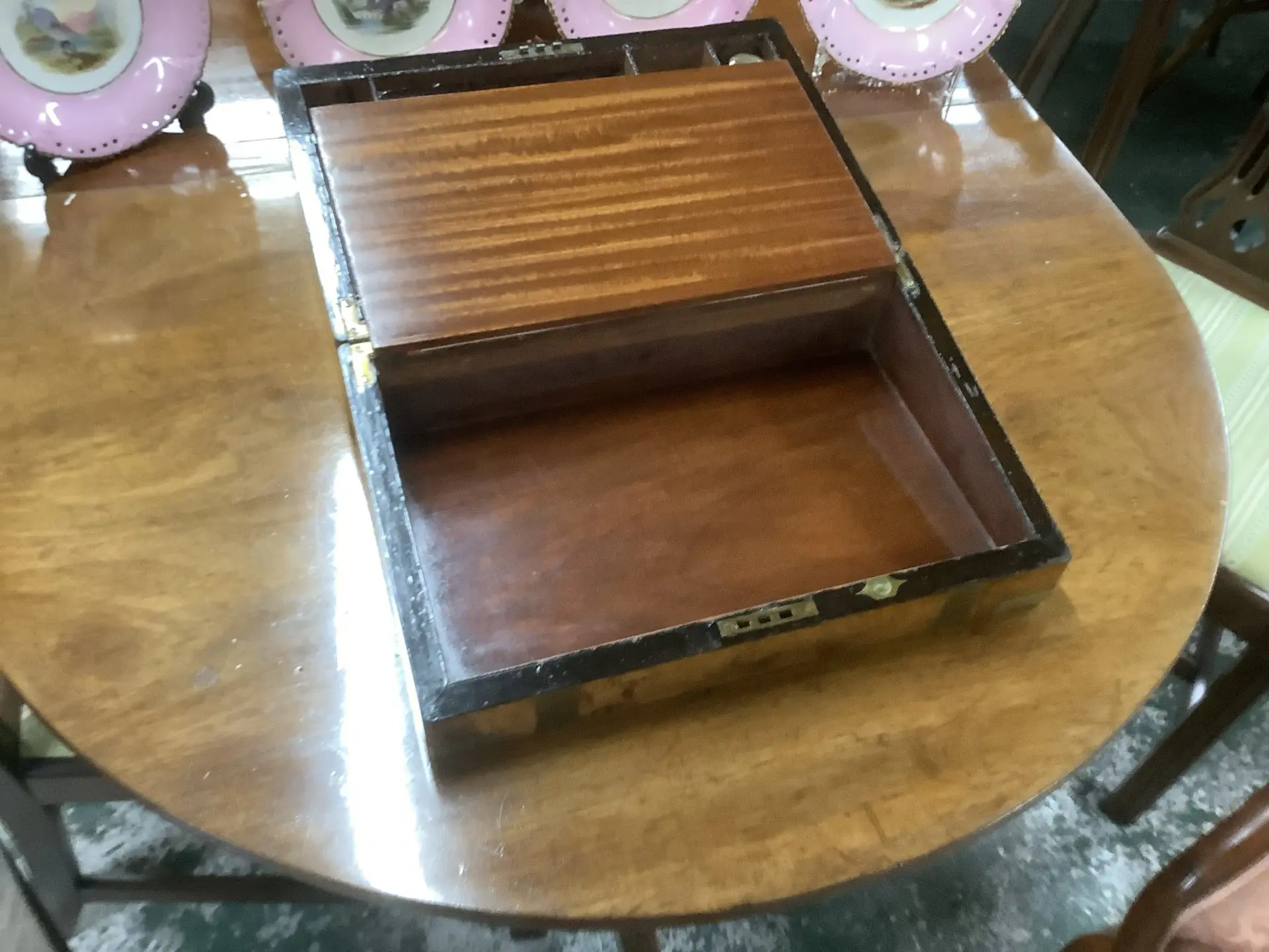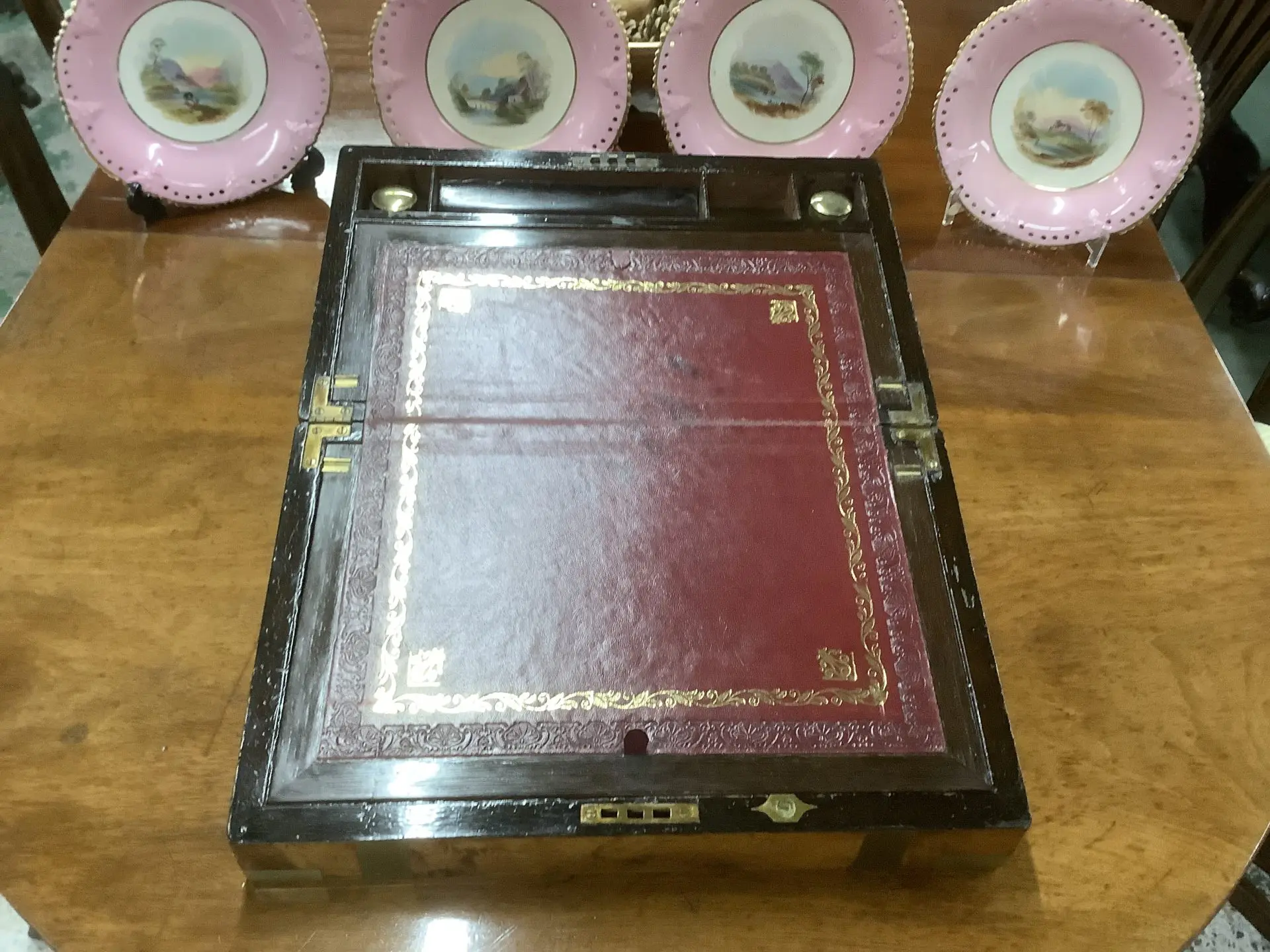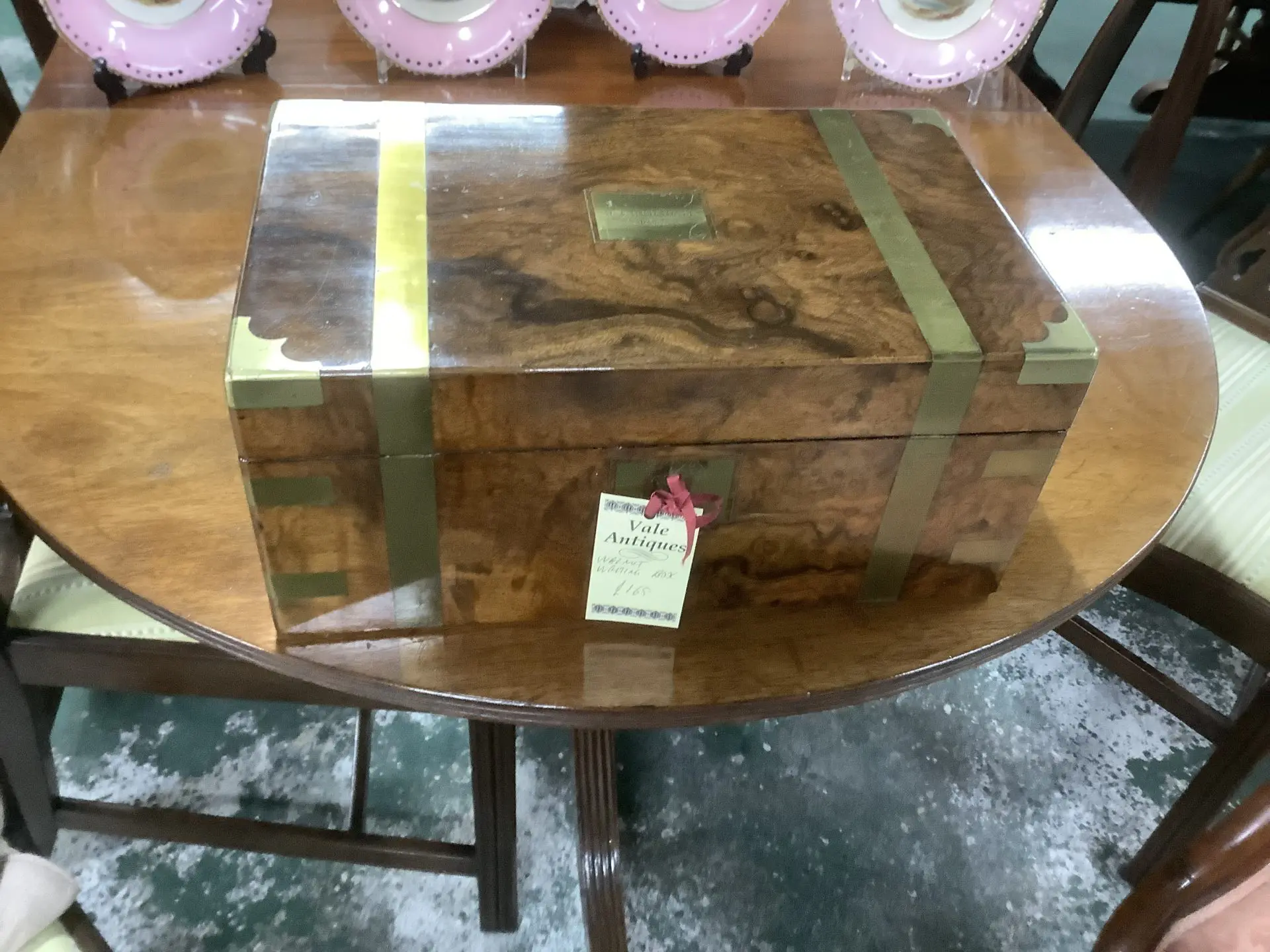 Brass Bound Walnut Writing Box with inset engraved plated in very good condition. Has a key and original pair of inkwells.
