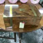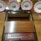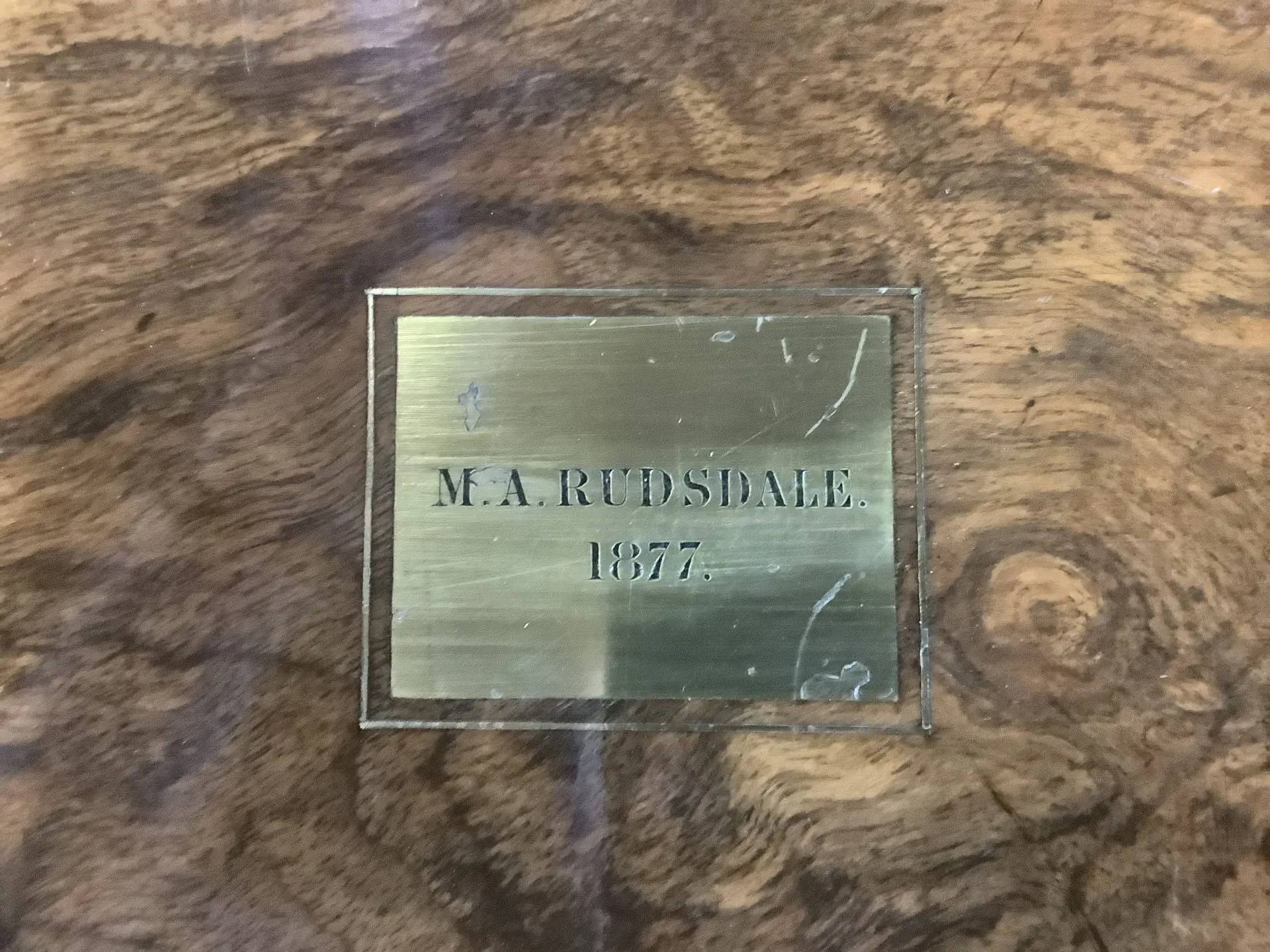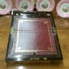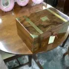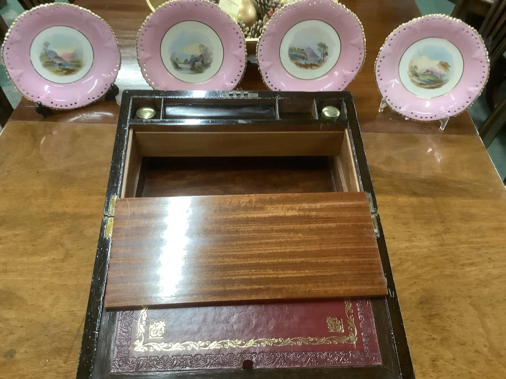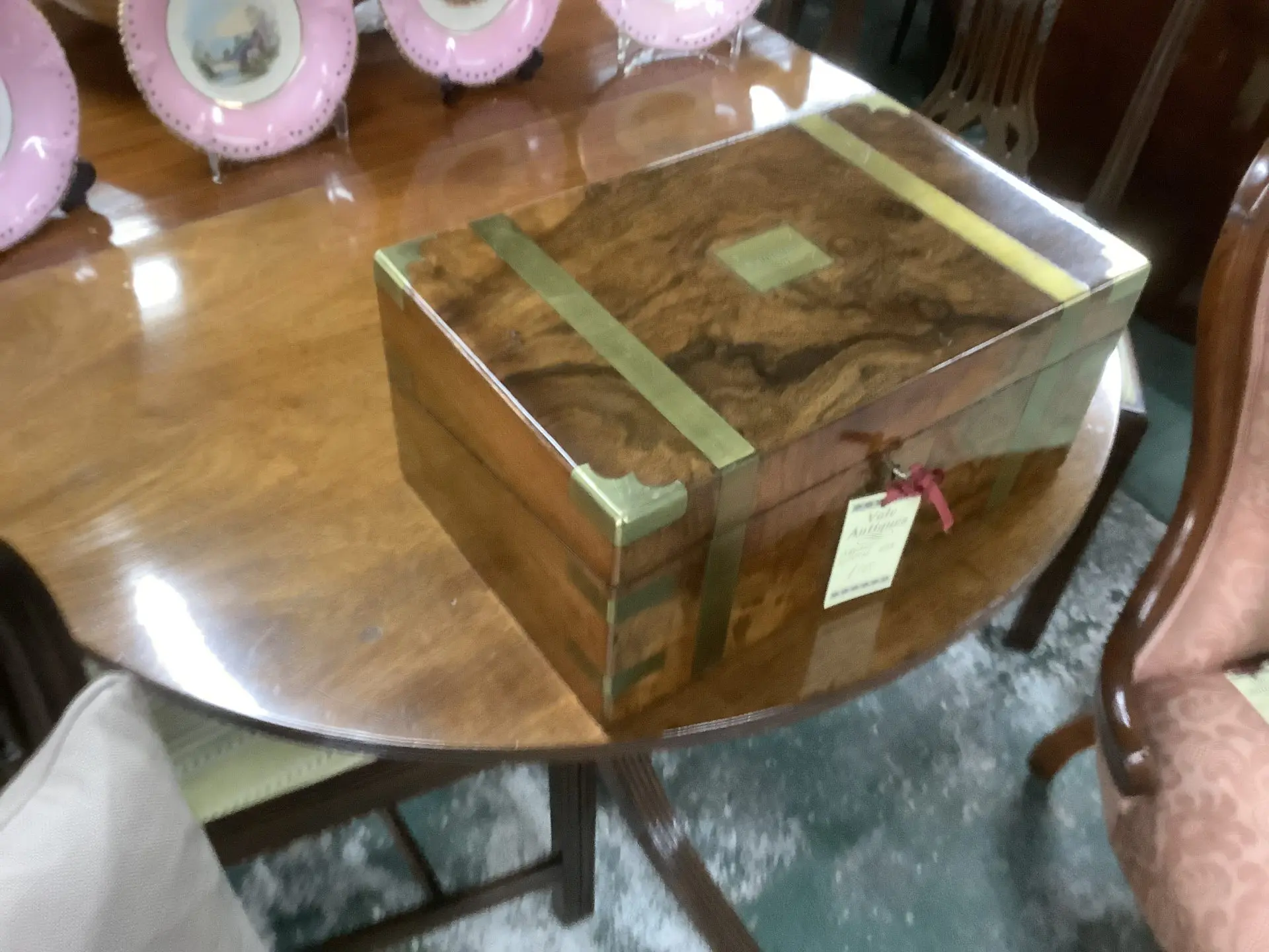Brass Bound Walnut Writing Box with inset engraved plated in very good condition. Has a key and original pair of inkwells.